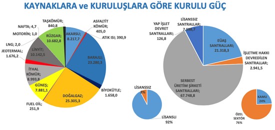 TEİAŞ’ın verilerinden derlenen bilgiye göre, kurulu güçte en büyük pay 25.305,3 MW ile doğal gaz santrallerinden sonra ise 23.280,3 MW güç ile barajlı kaynakların oldu. Rüzgar santrallerin kurulu gücü 10.682,8 MW, geride kalan linyit santrallerinin kapasitesi ise 10.142,5 MW, ithal kömür yakıtlı santrallerin kurulu gücü 8.993,8 MW olurken akarsu tipi hidroelektrik santrallerin kurulu gücü 8.217,7 MW, jeotermalin 1.676,2 MW ve biyokütlenin 1.658,0 MW olarak gerçekleşti.