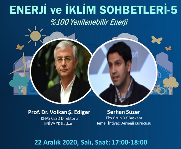 CESD Müdürü ve ENİVA YK Başkanı Prof. Dr. Volkan Ş. Ediger moderatörlüğünde konuğumuz Eko Grup Yönetim Kurulu Başkanı Serhan Süzer ile “%100 Yenilenebilir Enerji” teması ile bir sohbet gerçekleştirilecektir.