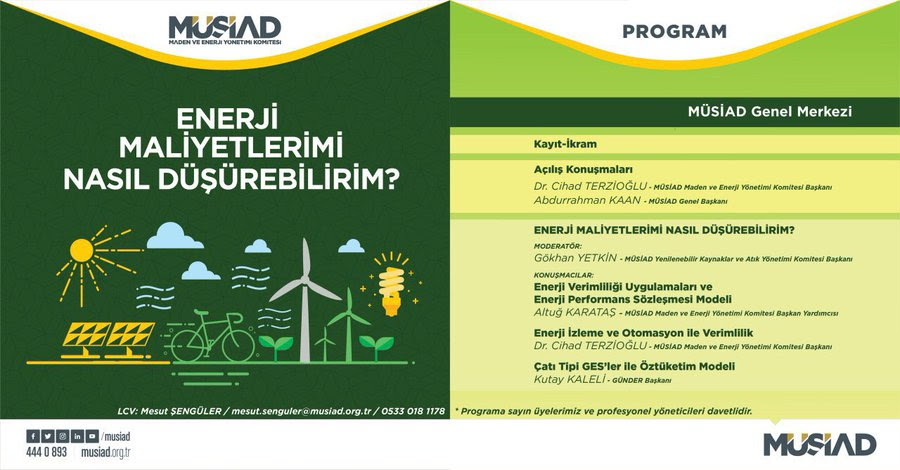 Müstakil Sanayici ve İşadamları Derneği MÜSİAD, GÜNDER Başkanı Kutay KALELİ’nin de katılım sağlayacağı “Enerji Maliyetlerimi Nasıl Düşürebilirim?” adlı etkinlik bilgileri aşağıda yer almaktadır.