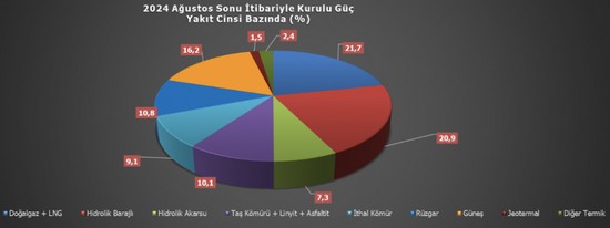 2024 yılı Ağustos ayı sonunda oluşan toplam kurulu gücün %21,7’lik kısmı (24.690 MW) doğal gaz ve LNG yakıt tipi santralleri ile karşılanırken, %20,9’luk kısmı (23.855 MW) barajlı hidrolik santraller tarafından karşılanmaktadır. Bu yakıt tiplerini %10,1’lik (11.452 MW) oran ile yerli kömür santralleri ve %9,1’lik oran (10.404 MW) ile ithal kömür santralleri izlemektedir. Akarsu tipi hidrolik santraller %7,3’lük bir orana (8.339 MW) sahipken, rüzgâr santralleri toplam kurulu gücün %10,8’lik bir kısmını (12.343 MW) oluşturmaktadır. Toplam kurulu gücün %16,2’lik kısmı (18.435 MW) güneş enerjisi santralleri, %1,5’lik kısmı (1.691 MW) jeotermal enerji santrallerinden oluşurken, %2,4’lük kısmı (2.689 MW) ise diğer termik santraller tarafından oluşturulmaktadır.