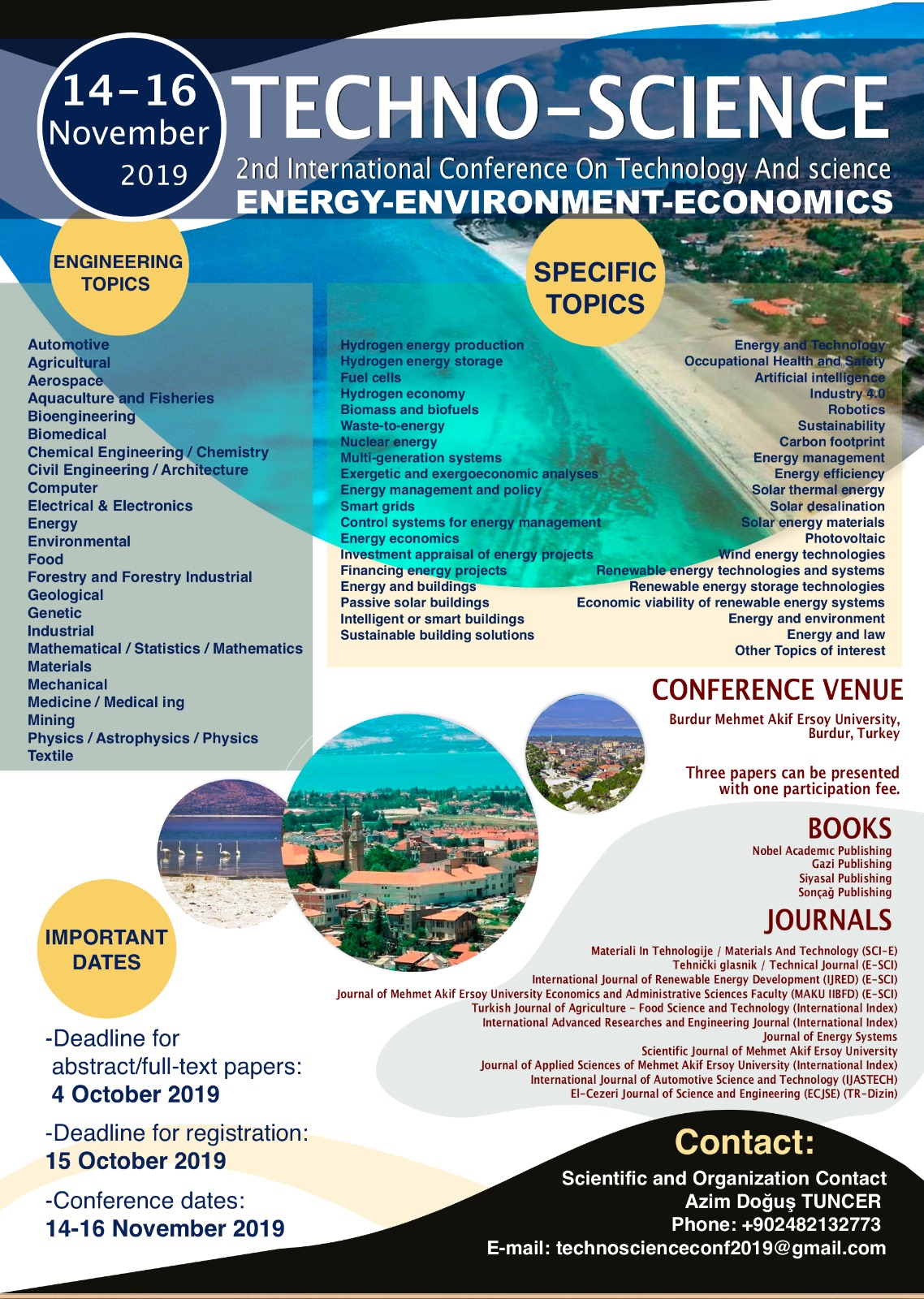 Organizasyon komitesinden yapılan açıklamada, 2’inci Uluslararası Teknoloji ve Bilim Konferansı’nın (Techno-Science) 14-16 Kasım 2019 tarihleri arasında Burdur’da düzenleneceği belirtildi.