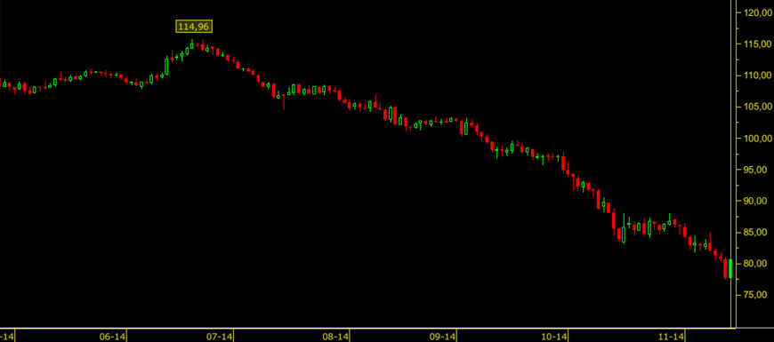 Bugün vadesi dolacak olan Ocak 2015 vadeli Brent petrolün varil fiyatı %4,1 düşerek Londra merkezli ICE Futures Europe borsasında 77,7 dolardan işlem gördü.