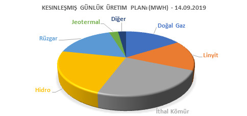 Bir önceki gün ile kıyaslandığında ortalama piyasa takas fiyatında –7.51 TL düşüş gözlemlenmektedir. Kesinleşmiş Günlük Üretim Planı (KGÜP) verilerine bakıldığında termik enerji dahilinde doğal gaz % 16, linyit % 15, ithal kömür % 24 oranında üretimin gerçekleşmesi beklenirken, yenilenebilir enerji dahilinde ise hidro % 23, rüzgar % 17, jeotermal % 3 oranında üretimin gerçekleşmesi beklenmektedir. Bununla birlikte fiyatlardaki düşüş, hafta sonu tüketim talebindeki düşüş ve üretimin ağırlıklı olarak kömür santrallerinde beklenmesi ile açıklanabilmektedir. Yarın için planlanan üretim bazlı Kesinleşmiş Günlük Üretim Planı (KGÜP) aşağıdaki grafikte yer almaktadır.
