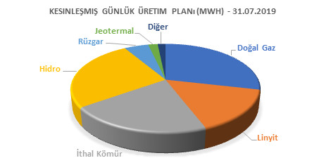 Bir önceki gün ile kıyaslandığında ortalama piyasa takas fiyatında 3 TL artış gözlemlenmektedir. Kesinleşmiş Günlük Üretim Planı (KGÜP) verilerine bakıldığında termik enerji dahilinde doğal gaz % 29, linyit % 16, ithal kömür % 21 oranında üretimin gerçekleşmesi beklenirken, yenilenebilir enerji dahilinde ise hidro % 26, rüzgar % 5, jeotermal % 2 oranında üretimin gerçekleşmesi beklenmektedir. Bununla birlikte fiyatlardaki artış, hafta içi tüketim talebindeki artış ve üretimin ağırlıklı olarak doğalgaz elektrik santrallerinde beklenmesi ile açıklanabilmektedir. Yarın için planlanan üretim bazlı Kesinleşmiş Günlük Üretim Planı (KGÜP) aşağıdaki grafikte yer almaktadır.