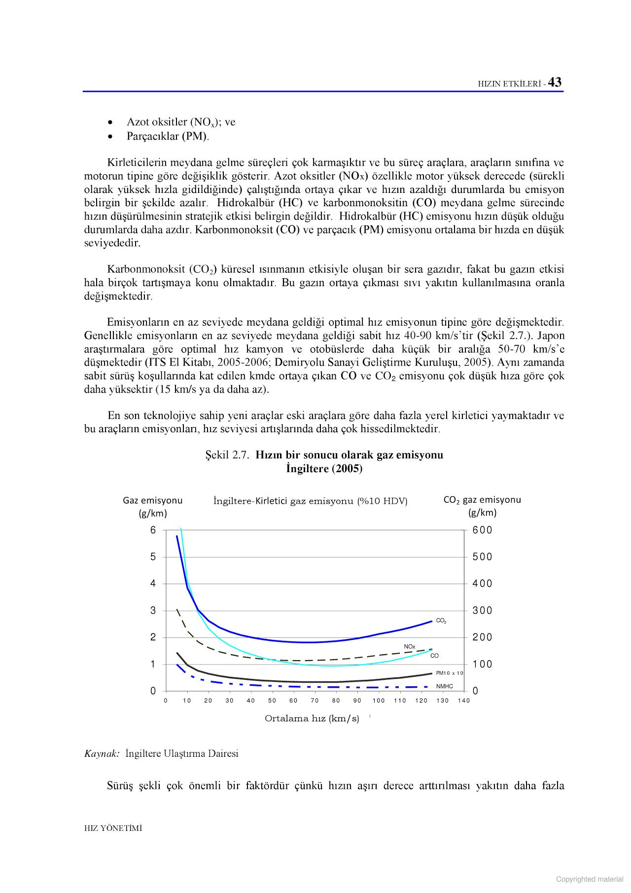 Raporu (kitabında- Hızın Etkileri bölümünde) 43. Sayfada . Kirleticilerin etkilerini araca, araç sınıfı ve motor tipine bağladıktan sonra , Azot Oksitler( NO x ) motor yüüksek derecede sürekli yüksek hızla gidildiğinde ortaya çıktığını ve hızın azaldığı durumda emisyonun azaldığını göstermektedir. HC(Hidrokalbür) CO (Karbonmonoksit) meydana gelme sürecinde hızın düşürülmesinin stratejik etkisi belirgin değildir. HC(Hidrokalbür) emisyonu hızın düşük olduğu durumlarda daha azdır . CO ve parçacık emisyonu (PM) ortalama bir hızda en düşük seviyede olduğunu belirtmektedir [iii]