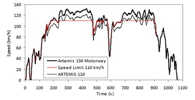 ARTEMIS 130: Tipik bir (driving cycle) sürüş döngüsü, 120 km / s’lik bir hız sınırını varsayarsak, buna pek saygı gösterilmez ve riayet edilmez , bu da bazı zamanlarda hızlanmanın olabileceğine işaret eder.