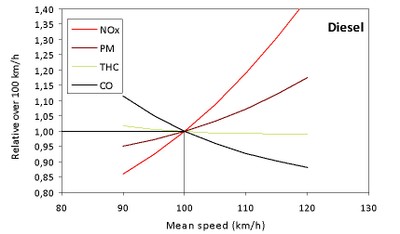 Benzinli motorlar için, yaklaşık 115 km / saate kadar hız artışı, NOx emisyonlarının düşmesine neden olur, ancak emisyonlar bu hızın üzerinde tekrar yükselir. Benzinli araçlar, dizel araçlardan çok daha az NOx üretmektedir. COPERT’e göre, benzinli bir Euro 4 otomobil, 100 km / saat’lik bir mütekabil dizel otomobilin 560 mg / km’sine kıyasla, 19 mg / km NOx üretiyor. Bu nedenle, NOx üzerinde otoyollarda hızı düşürmenin genel etkisi, dizel NOx baskın olduğu ve hızın düşmesi ile açıkça düştüğü için olumlu olacaktır.