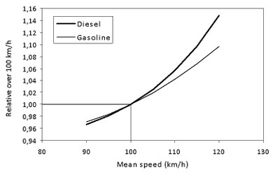 Bu notun amaçları doğrultusunda, EMISIA ([1]), bir otoyol hız sınırını 120 ila 110 km / s arasında azaltmak için yakıt tüketimini taklit etmek için üç sürüş döngüsü simülasyonu gerçekleştirdi. Simülasyon, Avrupa ülkelerinde kullanılan tipik dizel ve benzinli binek otomobillerini temsil eden iki orta sınıf araç kullandı (ekte sunulan şekilde 1.4 litre Euro 4 emisyon standardı).