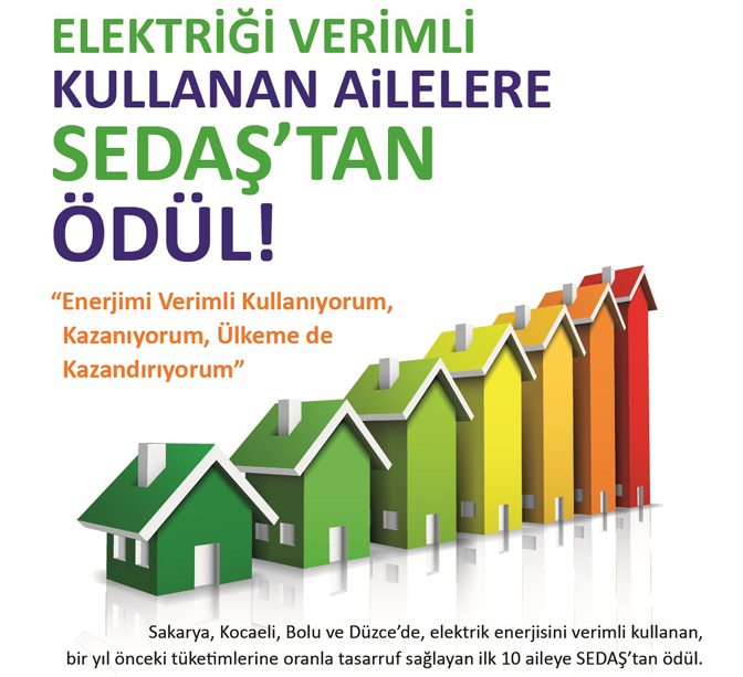 SEDAŞ Elektrik Dağıtım A.Ş. (SEDAŞ) enerji tasarrufu hakkında farkındalık oluşturmak amacıyla başlattığı projelere bir yenisini ekledi. Sakarya, Kocaeli, Bolu ve Düzce’deki daha önce ilköğretim öğrencilerine yönelik ‘Enerjinin Güvenli Kullanımı’ konulu eğitim seminerleri vererek resim yarışması düzenleyen SEDAŞ, şimdi de enerjinin verimli kullanımı ve gereksiz yere kullanımının engellenmesi ve enerji tasarrufunun teşvik edilmesini sağlamak amacıyla ‘Enerjimi verimli kullanıyorum, kazanıyorum, ülkeme de kazandırıyorum’ adlı projeyi hayata geçiriyor. Proje kapsamında 2016 yılına oranla 2017 içerisinde konutlarında en fazla elektrik tasarrufu yapan 10 ailenin belirli miktardaki elektrik tüketimi bedeli SEDAŞ tarafından karşılanacak.