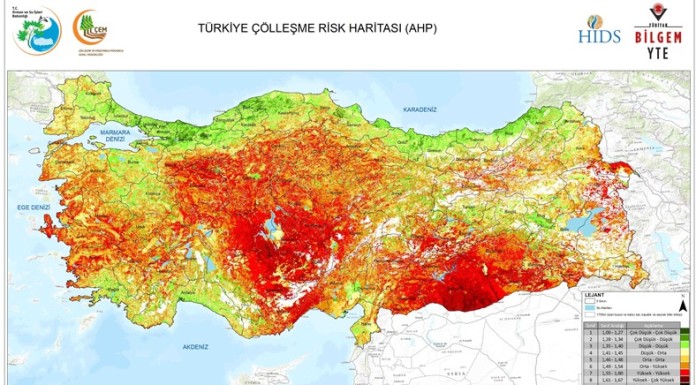 Haritaya göre Türkiye’nin yaklaşık yüzde 47’si orta ve üzeri ‘çok yüksek risk’ grubunda yer alıyor. Çölleşmenin görüldüğü Konya-Karapınar, Iğdır-Aralık ve Urfa-Ceylanpınar bu bölgeleri kapsıyor. Tuz Gölü havzası, Ereğli-Karaman bölgesi, Urfa-Ceylanpınar-Mardin-Batman hattı, Eskişehir çevresi ise orta ve yüksek risk grubunu oluşturuyor.