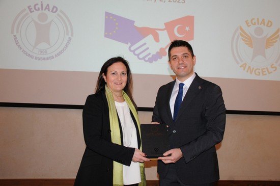 Heyet adına konuşma yapan Avrupa Birliği Türkiye Delegasyonu Başkan Yardımcısı Eleftheria Pertzınıdou; EGİAD’ın genç ve dinamik üye profilinden ve yaptığı projelerden övgüyle bahsederek özellikle Yeşil Mutabakat, Sürdürülebilirlik, İklim Farkındalığı, Teknolojik Dönüşüm, Think Tank Raporları ve bilhassa etkinliğin gerçekleştiği tarihi mekânın tamamen üye katkılarıyla restorasyonundan çok etkilendiklerini paylaştı.