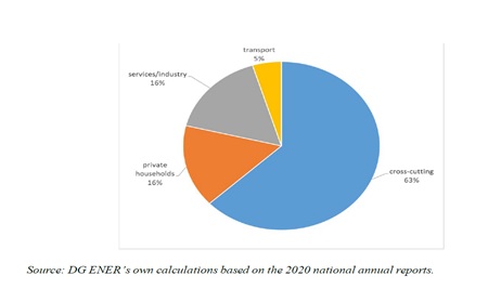 Uygulanan politika önlemlerinin hedeflediği sektörlerde, Üye Devletler tarafından bildirilen en büyük enerji tasarrufu payı, tek bir sektöre atfedilemeyen kesişen önlemlerden kaynaklanmaktadır (Şekil 2). Önlemlerin çoğu (bildirilen önlemlere göre), çoğu şirketi (ulaşım şirketleri hariç) ve kamu sektörünü (özel hanehalkı sektörüne dahil olan kamu kurumlarının sahip olduğu konutlar hariç) kapsayan hizmetleri ve sektörü hedeflemektedir.