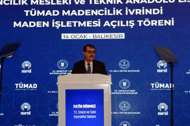 Enerji ve Tabii Kaynaklar Bakanı Fatih Dönmez, Milli Eğitim Bakanı Mahmut Özer’in de katıldığı, Balıkesir’in İvrindi ilçesinde Nurettin Çarmıklı Madencilik Mesleki ve Teknik Anadolu Lisesi ve TÜMAD Madencilik altın ve gümüş madeni işletmesinin açılış töreninde yaptığı konuşmada, yaklaşık üç yıl önce temelini attıkları meslek lisesinin bugün açılışını gerçekleştirdiklerini söyledi.
