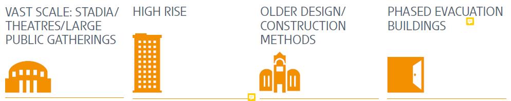 Ve bazı durumlarda, örneğin yalnızca bir ana kaçış yoluna sahip olan bazı eski binalarda olduğu gibi, binanın yaşı da sorun yaratabilir. Stadyumlar gibi büyük spor komplekslerinde, mevcut tüm kaçış yollarını kapsamak veya paniği azaltmak için yüksek düzeyde aydınlatma gerekebilir. Veya tahliyesi daha uzun süren (örneğin gökdelenler) veya aşamalı tahliye gerektiren binalar için daha uzun süreli aydınlatma gerekebilir.