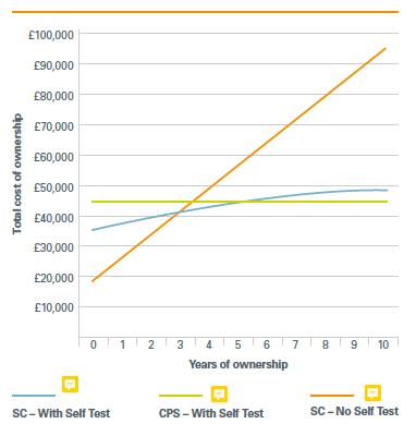 Bir üniversite yerleşkesi içindeki yaşam döngüsü maliyetlerine ilişkin Eaton verileri, manuel test özelliğine sahip bağımsız bir sistemin başlangıç maliyetini önemli ölçüde azaltacağını; ancak on yıl boyunca otomatik test özelliğine sahip bağımsız bir sistemin veya merkezi batarya ünitesinin (CBU) iki katından daha pahalıya mal olacağını göstermiştir. Hem merkezi batarya sistemi hem de otomatik test çözümlerine sahip bağımsız sistemler, daha yüksek bir CAPEX harcaması gerektirir; ancak o sırada büyük ölçüde benzer bir toplam sahip olma maliyeti ortaya çıkar. Her bina sahibi veya operatörü, kendileri için en iyi CAPEX/OPEX kombinasyonunun hangisi olduğuna kendi karar verecektir.