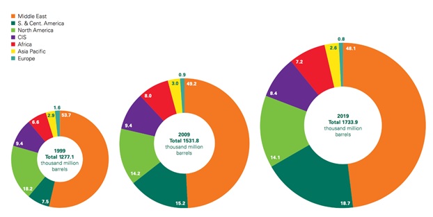 Kanıtlanmış petrol rezervlerinin küresel dağılımında Ortadoğu %48.1 ile hala en çok petrol rezervine sahip bir bölgedir.