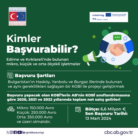 Proje teklif çağrısına ve detaylara ulaşmak için: https://cbc.ab.gov.tr/duyuru/50784/edirne-ve-kirklarelindeki-kobi-ler-icin-bir-ilk-cevre-dostu-sinir-otesi-isbirligi-proje-teklif-cagrisi-acildi?lang=tr adresini ziyaret edebilirsiniz.
