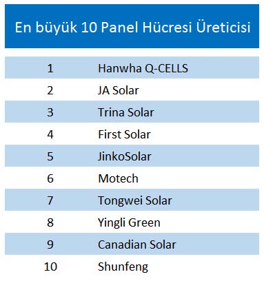 Hücre üretiminde, Hanwha Q-CELLS dünyanın en büyük güneş paneli hücresi üreticisi oldu, ikinci sırada JA Solar ve üçüncü sırada Trina Solar yer aldı. Hücre üretimiyle birlikte panel tedariği olarak sıralandığında, birinci sırada Jinko Solar, ikinci sırada Trina Solar ve üçüncü sırada Canadian Solar oldu. IHS Teknoloji firması’nın 2014 verilerine göre yapılan çalışmada en büyük üretici konumunda Trina Solar yer almıştı, 2016 yılı verilerinde ikinci sıraya yerleşti. Benzer şekilde 2014 yılında ikinci sırada olan Yingli Solar, sekizinci sırada yerini aldı.