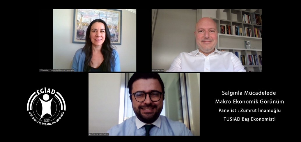 Türkiye Sanayicileri ve İş İnsanları Derneği (TÜSİAD) Baş Ekonomisti Dr. Zümrüt İmamoğlu ise, Türkiye’de ve diğer ülkelerde virüs salgınına dair istatistiklerle başladığı sunumunda, mevcut ulusal ve küresel ekonomik durum ile açıklanan destek paketlerine dair değerlendirmelerde bulundu. Türkiye’nin pandemi sürecini iyi yönettiğini belirten İmamoğlu, “Türkiye kartlarını iyi oynamalı. Türkiye’nin şu anda elinde sağlık sisteminden ötürü iyi bir hikâye var. Yeni dalgalar gelse bile diğer ülkelere göre üstesinden gelebileceği daha iyi bir sağlık sistemi ve tedarik zinciri bulunmakta. Bu bir fırsattır. Çünkü şu anda tüm dünya ülkelerinin gündeminde sağlık sistemi var. Bu yeni fırsatları iyi görüp, Avrupa’nın Türkiye’ye bakış açısını yumuşatabiliriz. Bu fırsatı iyi kullanabiliriz” dedi. İmamoğlu, toplantının son bölümünde ise katılımcıların sorularını da yanıtladı.