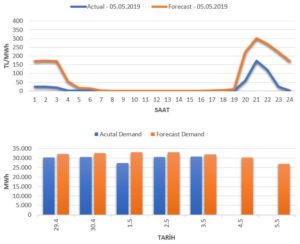 *Tahminleme Modeli; istatistiksel tahminleme metodu olan SARIMA (Seasonal Autoregressive Integrated Moving Average) kullanılarak MATLAB yazılım geliştirme platformunda hazırlanmıştır. Model ve diğer tüm kullanılan veriler dahilinde girdi verileri olarak EPİAŞ Şeffaflık Platformunda günlük yayınlanan piyasa takas fiyatları ve gerçekleşen tüketim verileri kullanılmaktadır. Model ile ilgili detaylı bilgi alabilmek için lütfen iletişime geçiniz.