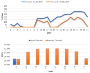 Tahminleme Modeli* analizi sonucu ortalama piyasa takas fiyatı 69.5 TL/MWh ve ortalama tüketim 31,822 MWh olarak öngörülmektedir. Modelin piyasa takas fiyatına dair başarı oranı günlük % 65, tüketime dair başarı oranı** ise günlük % 100 olarak hesaplanırken, bugüne kadar yapılan piyasa takas fiyatına dair analizlere göre başarı oranı % 88, tüketime dair başarı oranı ise % 95 olarak hesaplanmaktadır. Saatlik yarın için oluşan ve tahmin edilen piyasa takas fiyatları ile haftalık bazda tahmin edilen ve gerçekleştikçe yer alacak günlük ortalama tüketim değerleri aşağıdaki grafiklerde yer almaktadır.