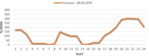 Yarından sonraki gün için oluşacak ortalama piyasa takas fiyatı 121.32 TL/MWH olarak tahmin edilmektedir. Buna bağlı olarak günün maksimum fiyatı 303.23 TL/MWh olarak 20:00 – 21:00 saat aralığında, minimum fiyatı 2.01 TL/MWh olarak 06:00 – 07:00 saat aralığında gerçekleşeceği öngörülmektedir. Puant saatlerde (17:00 – 22:00) tahmini ortalama piyasa takas fiyatı ise 256.61 TL/MWh olarak hesaplanabilmektedir. Saatlik oluşacak piyasa takas fiyatı tahminleri aşağıdaki grafikte yer almaktadır.