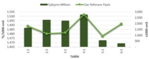 Organize Toptan Doğal Gaz Satış Piyasası (OTSP) dahilinde 01.05.2019 – 06.05.2019 tarihleri arası ortalama Gaz Referans Fiyatı (GRF) 1,486.92 TL/1000 sm3 olarak belirlenirken, aynı tarihler arasında toplam gerçekleşen eşleşmelerin miktarı ise 9,857 x1000 sm3 olarak belirlendi. İlgili tarihler arasında günlük Gaz Referans Fiyatı (GRF) ile Eşleşme Miktarı verileri aşağıdaki grafikte yer almaktadır.