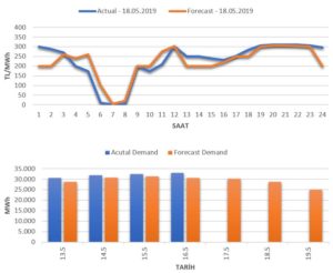 *Tahminleme Modeli; istatistiksel tahminleme metodu olan SARIMA (Seasonal Autoregressive Integrated Moving Average) kullanılarak MATLAB yazılım geliştirme platformunda hazırlanmıştır. Model ve diğer tüm kullanılan veriler dahilinde girdi verileri olarak EPİAŞ Şeffaflık Platformunda günlük yayınlanan piyasa takas fiyatları ve gerçekleşen tüketim verileri kullanılmaktadır. Model ile ilgili detaylı bilgi alabilmek için lütfen iletişime geçiniz.