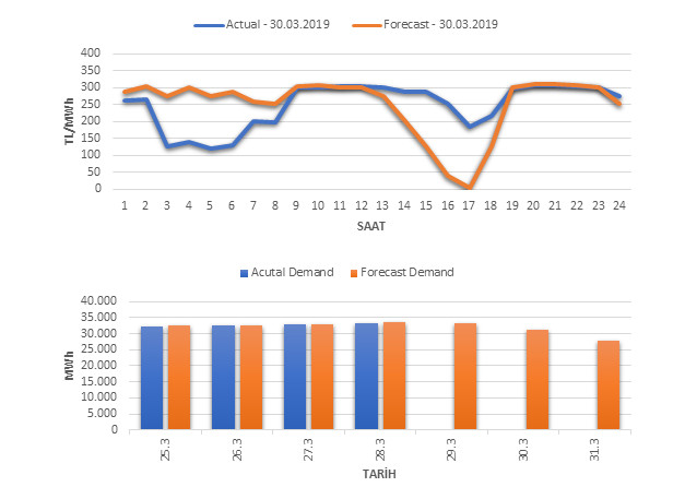 Tahminleme Modeli* analizi sonucu ortalama piyasa takas fiyatı 250.34 TL/MWh ve ortalama tüketim 31,232 MWh olarak öngörülmektedir. Modelin piyasa takas fiyatına dair başarı oranı günlük % 48, tüketime dair başarı oranı** ise günlük % 99 olarak hesaplanırken, bugüne kadar yapılan piyasa takas fiyatına dair analizlere göre başarı oranı % 88, tüketime dair başarı oranı ise % 95 olarak hesaplanmaktadır. Saatlik yarın için oluşan ve tahmin edilen piyasa takas fiyatları ile haftalık bazda tahmin edilen ve gerçekleştikçe yer alacak günlük ortalama tüketim değerleri aşağıdaki grafiklerde yer almaktadır.
