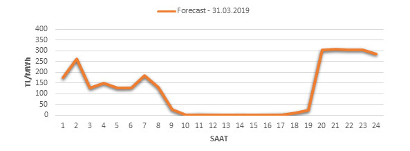Yarından sonraki gün için oluşacak ortalama piyasa takas fiyatı 119.73 TL/MWH olarak tahmin edilmektedir. Buna bağlı olarak günün maksimum fiyatı 307.25 TL/MWh olarak 20:00 – 21:00 saat aralığında, minimum fiyatı 0.79 TL/MWh olarak 12:00 – 13:00 saat aralığında gerçekleşeceği öngörülmektedir. Puant saatlerde (17:00 – 22:00) tahmini ortalama piyasa takas fiyatı ise 208.91 TL/MWh olarak hesaplanabilmektedir. Saatlik oluşacak piyasa takas fiyatı tahminleri aşağıdaki grafikte yer almaktadır.