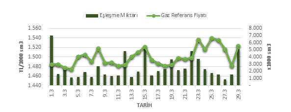 Organize Toptan Doğal Gaz Satış Piyasası (OTSP) dahilinde 01.03.2019 – 29.03.2019 tarihleri arası ortalama Gaz Referans Fiyatı (GRF) 1,499.46 TL/1000 sm3 olarak belirlenirken, aynı tarihler arasında toplam gerçekleşen eşleşmelerin miktarı ise 72,024 x1000 sm3 olarak belirlendi. İlgili tarihler arasında günlük Gaz Referans Fiyatı (GRF) ile Eşleşme Miktarı verileri aşağıdaki grafikte yer almaktadır.