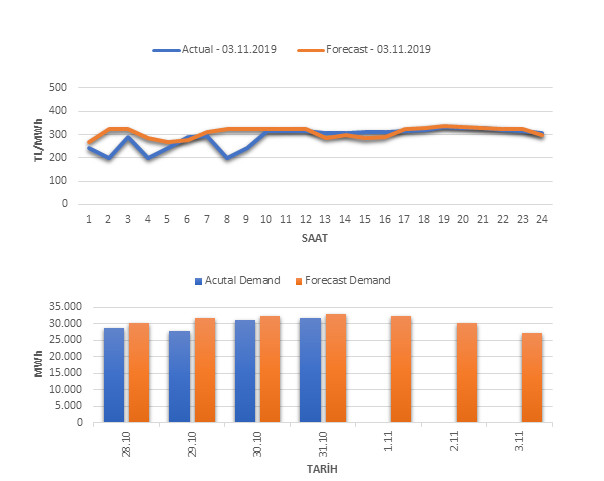 Tahminleme Modeli* analizi sonucu ortalama piyasa takas fiyatı 307.93 TL/MWh ve ortalama tüketim 27,173 MWh olarak öngörülmektedir. Modelin piyasa takas fiyatına dair başarı oranı günlük % 66, tüketime dair başarı oranı** ise günlük % 97 olarak hesaplanırken, bugüne kadar yapılan piyasa takas fiyatına dair analizlere göre başarı oranı % 91, tüketime dair başarı oranı ise % 93 olarak hesaplanmaktadır. Saatlik yarın için oluşan ve tahmin edilen piyasa takas fiyatları ile haftalık bazda tahmin edilen ve gerçekleştikçe yer alacak günlük ortalama tüketim değerleri aşağıdaki grafiklerde yer almaktadır.
