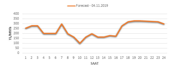 Yarından sonraki gün için oluşacak ortalama piyasa takas fiyatı 239.77 TL/MWH olarak tahmin edilmektedir. Buna bağlı olarak günün maksimum fiyatı 329.34 TL/MWh olarak 19:00 – 20:00 saat aralığında, minimum fiyatı 100.01 TL/MWh olarak 09:00 – 10:00 saat aralığında gerçekleşeceği öngörülmektedir. Puant saatlerde (17:00 – 22:00) tahmini ortalama piyasa takas fiyatı ise 325.06 TL/MWh olarak hesaplanabilmektedir. Saatlik oluşacak piyasa takas fiyatı tahminleri aşağıdaki grafikte yer almaktadır.