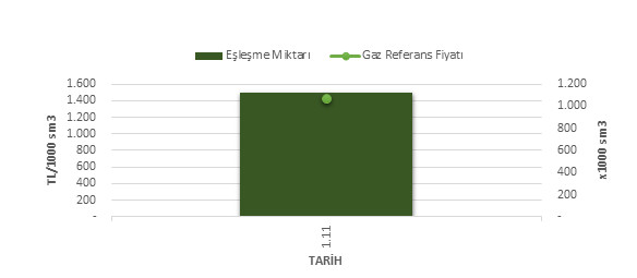 Organize Toptan Doğal Gaz Satış Piyasası (OTSP) dahilinde 01.11.2019 – 02.11.2019 tarihleri arası ortalama Gaz Referans Fiyatı (GRF) 1,425.67 TL/1000 sm3 olarak belirlenirken, aynı tarihler arasında toplam gerçekleşen eşleşmelerin miktarı ise 1,126 x1000 sm3 olarak belirlendi. İlgili tarihler arasında günlük Gaz Referans Fiyatı (GRF) ile Eşleşme Miktarı verileri aşağıdaki grafikte yer almaktadır.