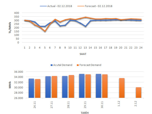Tahminleme Modeli* analizi sonucu ortalama piyasa takas fiyatı 297.64 TL/MWh ve ortalama tüketim 30,059 MWh olarak öngörülmektedir. Modelin piyasa takas fiyatına dair başarı oranı günlük % 55, tüketime dair başarı oranı** ise günlük % 99 olarak hesaplanırken, bugüne kadar yapılan piyasa takas fiyatına dair analizlere göre başarı oranı % 87, tüketime dair başarı oranı ise % 93 olarak hesaplanmaktadır. Saatlik yarın için oluşan ve tahmin edilen piyasa takas fiyatları ile haftalık bazda tahmin edilen ve gerçekleştikçe yer alacak günlük ortalama tüketim değerleri aşağıdaki grafiklerde yer almaktadır.
