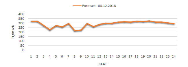 Yarından sonraki gün için oluşacak ortalama piyasa takas fiyatı 289.26 TL/MWH olarak tahmin edilmektedir. Buna bağlı olarak günün maksimum fiyatı 324.63 TL/MWh olarak 19:00 – 20:00 saat aralığında, minimum fiyatı 214.83 TL/MWh olarak 07:00 – 08:00 saat aralığında gerçekleşeceği öngörülmektedir. Puant saatlerde (17:00 – 22:00) tahmini ortalama piyasa takas fiyatı ise 314.22 TL/MWh olarak hesaplanabilmektedir. Saatlik oluşacak piyasa takas fiyatı tahminleri aşağıdaki grafikte yer almaktadır.