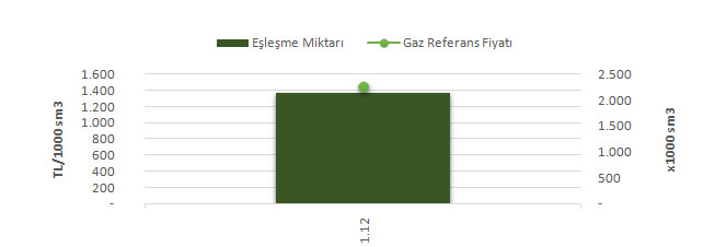 Organize Toptan Doğal Gaz Satış Piyasası (OTSP) dahilinde 01.12.2018 – 01.12.2018 tarihleri arası ortalama Gaz Referans Fiyatı (GRF) 1,448.36 TL/1000 sm3 olarak belirlenirken, aynı tarihler arasında toplam gerçekleşen eşleşmelerin miktarı ise 2,149 x1000 sm3 olarak belirlendi. İlgili tarihler arasında günlük Gaz Referans Fiyatı (GRF) ile Eşleşme Miktarı verileri aşağıdaki grafikte yer almaktadır.