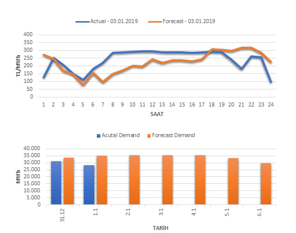 Tahminleme Modeli* analizi sonucu ortalama piyasa takas fiyatı 223.4 TL/MWh ve ortalama tüketim 35,419 MWh olarak öngörülmektedir. Modelin piyasa takas fiyatına dair başarı oranı günlük % 60, tüketime dair başarı oranı** ise günlük % 77 olarak hesaplanırken, bugüne kadar yapılan piyasa takas fiyatına dair analizlere göre başarı oranı % 88, tüketime dair başarı oranı ise % 94 olarak hesaplanmaktadır. Saatlik yarın için oluşan ve tahmin edilen piyasa takas fiyatları ile haftalık bazda tahmin edilen ve gerçekleştikçe yer alacak günlük ortalama tüketim değerleri aşağıdaki grafiklerde yer almaktadır.