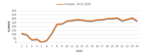 Yarından sonraki gün için oluşacak ortalama piyasa takas fiyatı 220.25 TL/MWH olarak tahmin edilmektedir. Buna bağlı olarak günün maksimum fiyatı 314.71 TL/MWh olarak 19:00 – 20:00 saat aralığında, minimum fiyatı 5.01 TL/MWh olarak 04:00 – 05:00 saat aralığında gerçekleşeceği öngörülmektedir. Puant saatlerde (17:00 – 22:00) tahmini ortalama piyasa takas fiyatı ise 302.54 TL/MWh olarak hesaplanabilmektedir. Saatlik oluşacak piyasa takas fiyatı tahminleri aşağıdaki grafikte yer almaktadır.