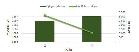 Organize Toptan Doğal Gaz Satış Piyasası (OTSP) dahilinde 01.12.2018 – 02.01.2019 tarihleri arası ortalama Gaz Referans Fiyatı (GRF) 1,586.46 TL/1000 sm3 olarak belirlenirken, aynı tarihler arasında toplam gerçekleşen eşleşmelerin miktarı ise 5,563 x1000 sm3 olarak belirlendi. İlgili tarihler arasında günlük Gaz Referans Fiyatı (GRF) ile Eşleşme Miktarı verileri aşağıdaki grafikte yer almaktadır.
