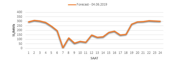 Yarından sonraki gün için oluşacak ortalama piyasa takas fiyatı 199.76 TL/MWH olarak tahmin edilmektedir. Buna bağlı olarak günün maksimum fiyatı 309.22 TL/MWh olarak 01:0002:00 saat aralığında, minimum fiyatı 8.02 TL/MWh olarak 06:0007:00 saat aralığında gerçekleşeceği öngörülmektedir. Puant saatlerde (17:0022:00) tahmini ortalama piyasa takas fiyatı ise 270.43 TL/MWh olarak hesaplanabilmektedir. Saatlik oluşacak piyasa takas fiyatı tahminleri aşağıdaki grafikte yer almaktadır.