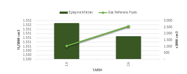Organize Toptan Doğal Gaz Satış Piyasası (OTSP) dahilinde 01.06.201902.06.2019 tarihleri arası ortalama Gaz Referans Fiyatı (GRF) 1,531.08 TL/1000 sm3 olarak belirlenirken, aynı tarihler arasında toplam gerçekleşen eşleşmelerin miktarı ise 4,592 x1000 sm3 olarak belirlendi. İlgili tarihler arasında günlük Gaz Referans Fiyatı (GRF) ile Eşleşme Miktarı verileri aşağıdaki grafikte yer almaktadır.