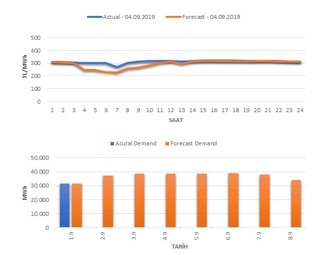 Tahminleme Modeli* analizi sonucu ortalama piyasa takas fiyatı 293.47 TL/MWh ve ortalama tüketim 38,551 MWh olarak öngörülmektedir. Modelin piyasa takas fiyatına dair başarı oranı günlük % 44, tüketime dair başarı oranı** ise günlük % 100 olarak hesaplanırken, bugüne kadar yapılan piyasa takas fiyatına dair analizlere göre başarı oranı % 91, tüketime dair başarı oranı ise % 94 olarak hesaplanmaktadır. Saatlik yarın için oluşan ve tahmin edilen piyasa takas fiyatları ile haftalık bazda tahmin edilen ve gerçekleştikçe yer alacak günlük ortalama tüketim değerleri aşağıdaki grafiklerde yer almaktadır.