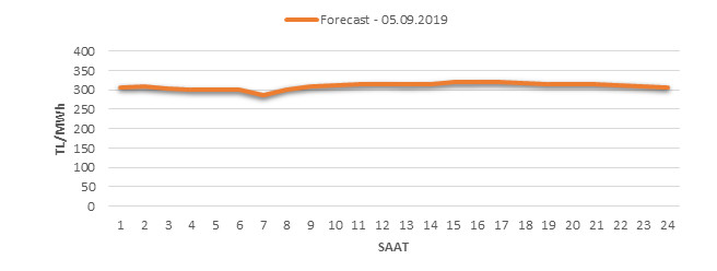 Yarından sonraki gün için oluÅŸacak ortalama piyasa takas fiyatı 310.69 TL/MWH olarak tahmin edilmektedir. Buna baÄŸlı olarak günün maksimum fiyatı 321.2 TL/MWh olarak 15:00 – 16:00 saat aralığında, minimum fiyatı 285.28 TL/MWh olarak 06:00 – 07:00 saat aralığında gerçekleÅŸeceÄŸi öngörülmektedir. Puant saatlerde (17:00 – 22:00) tahmini ortalama piyasa takas fiyatı ise 315.33 TL/MWh olarak hesaplanabilmektedir. Saatlik oluÅŸacak piyasa takas fiyatı tahminleri aÅŸağıdaki grafikte yer almaktadır.