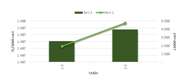 Organize Toptan Doğal Gaz Satış Piyasası (OTSP) dahilinde 01.09.2019 – 02.09.2019 tarihleri arası ortalama Gaz Referans Fiyatı (GRF) 1,487.3 TL/1000 sm3 olarak belirlenirken, aynı tarihler arasında toplam gerçekleşen eşleşmelerin miktarı ise 6,492 x1000 sm3 olarak belirlendi. İlgili tarihler arasında günlük Gaz Referans Fiyatı (GRF) ile Eşleşme Miktarı verileri aşağıdaki grafikte yer almaktadır.
