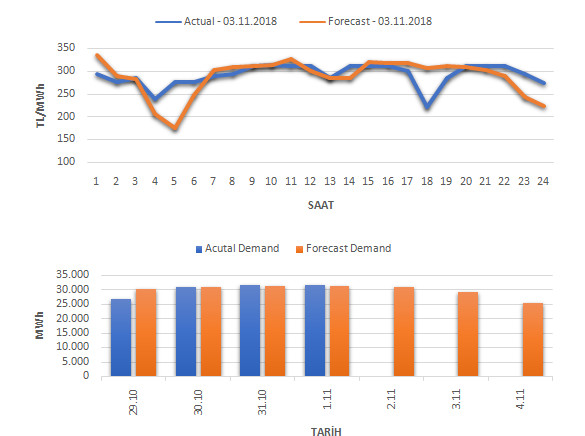 Tahminleme Modeli* analizi sonucu ortalama piyasa takas fiyatı 287.67 TL/MWh ve ortalama tüketim 29,205 MWh olarak öngörülmektedir. Modelin piyasa takas fiyatına dair başarı oranı günlük % 62, tüketime dair başarı oranı** ise günlük % 99 olarak hesaplanırken, bugüne kadar yapılan piyasa takas fiyatına dair analizlere göre başarı oranı % 87, tüketime dair başarı oranı ise % 91 olarak hesaplanmaktadır. Saatlik yarın için oluşan ve tahmin edilen piyasa takas fiyatları ile haftalık bazda tahmin edilen ve gerçekleştikçe yer alacak günlük ortalama tüketim değerleri aşağıdaki grafiklerde yer almaktadır.
