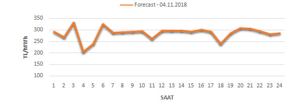 Yarından sonraki gün için oluşacak ortalama piyasa takas fiyatı 284.68 TL/MWH olarak tahmin edilmektedir. Buna bağlı olarak günün maksimum fiyatı 330.76 TL/MWh olarak 02:00 – 03:00 saat aralığında, minimum fiyatı 203.74 TL/MWh olarak 03:00 – 04:00 saat aralığında gerçekleşeceği öngörülmektedir. Puant saatlerde (17:00 – 22:00) tahmini ortalama piyasa takas fiyatı ise 284.31 TL/MWh olarak hesaplanabilmektedir. Saatlik oluşacak piyasa takas fiyatı tahminleri aşağıdaki grafikte yer almaktadır.