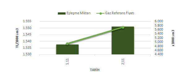 Organize Toptan Doğal Gaz Satış Piyasası (OTSP) dahilinde 01.10.2018 – 02.11.2018 tarihleri arası ortalama Gaz Referans Fiyatı (GRF) 1544.39 TL/1000 sm3 olarak belirlenirken, aynı tarihler arasında toplam gerçekleşen eşleşmelerin miktarı ise 10,635 x1000 sm3 olarak belirlendi. İlgili tarihler arasında günlük Gaz Referans Fiyatı (GRF) ile Eşleşme Miktarı verileri aşağıdaki grafikte yer almaktadır.