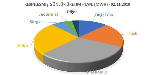 Bir önceki gün ile kıyaslandığında ortalama piyasa takas fiyatında –48.11 TL düşüş gözlemlenmektedir. Kesinleşmiş Günlük Üretim Planı (KGÜP) verilerine bakıldığında termik enerji dahilinde doğal gaz % 13, linyit % 20, ithal kömür % 30 oranında üretimin gerçekleşmesi beklenirken, yenilenebilir enerji dahilinde ise hidro % 25, rüzgar % 5, jeotermal % 4 oranında üretimin gerçekleşmesi beklenmektedir. Bununla birlikte fiyatlardaki düşüş, hafta sonu tüketim talebindeki düşüş ve üretimin ağırlıklı olarak kömür santrallerinde beklenmesi ile açıklanabilmektedir. Yarın için planlanan üretim bazlı Kesinleşmiş Günlük Üretim Planı (KGÜP) aşağıdaki grafikte yer almaktadır.
