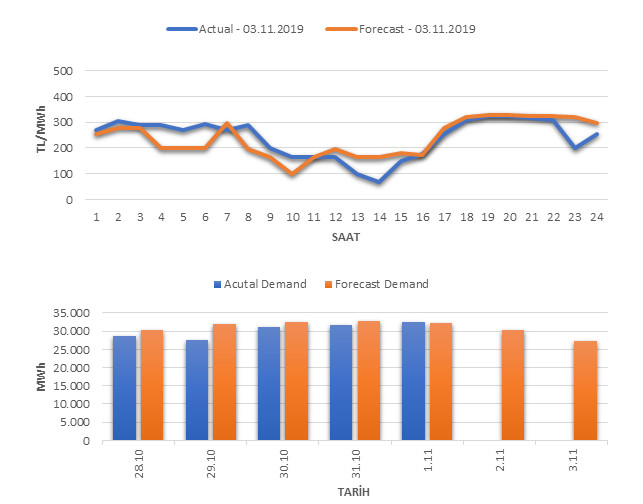 Tahminleme Modeli* analizi sonucu ortalama piyasa takas fiyatı 239.77 TL/MWh ve ortalama tüketim 27,173 MWh olarak öngörülmektedir. Modelin piyasa takas fiyatına dair başarı oranı günlük % 79, tüketime dair başarı oranı** ise günlük % 100 olarak hesaplanırken, bugüne kadar yapılan piyasa takas fiyatına dair analizlere göre başarı oranı % 91, tüketime dair başarı oranı ise % 93 olarak hesaplanmaktadır. Saatlik yarın için oluşan ve tahmin edilen piyasa takas fiyatları ile haftalık bazda tahmin edilen ve gerçekleştikçe yer alacak günlük ortalama tüketim değerleri aşağıdaki grafiklerde yer almaktadır.